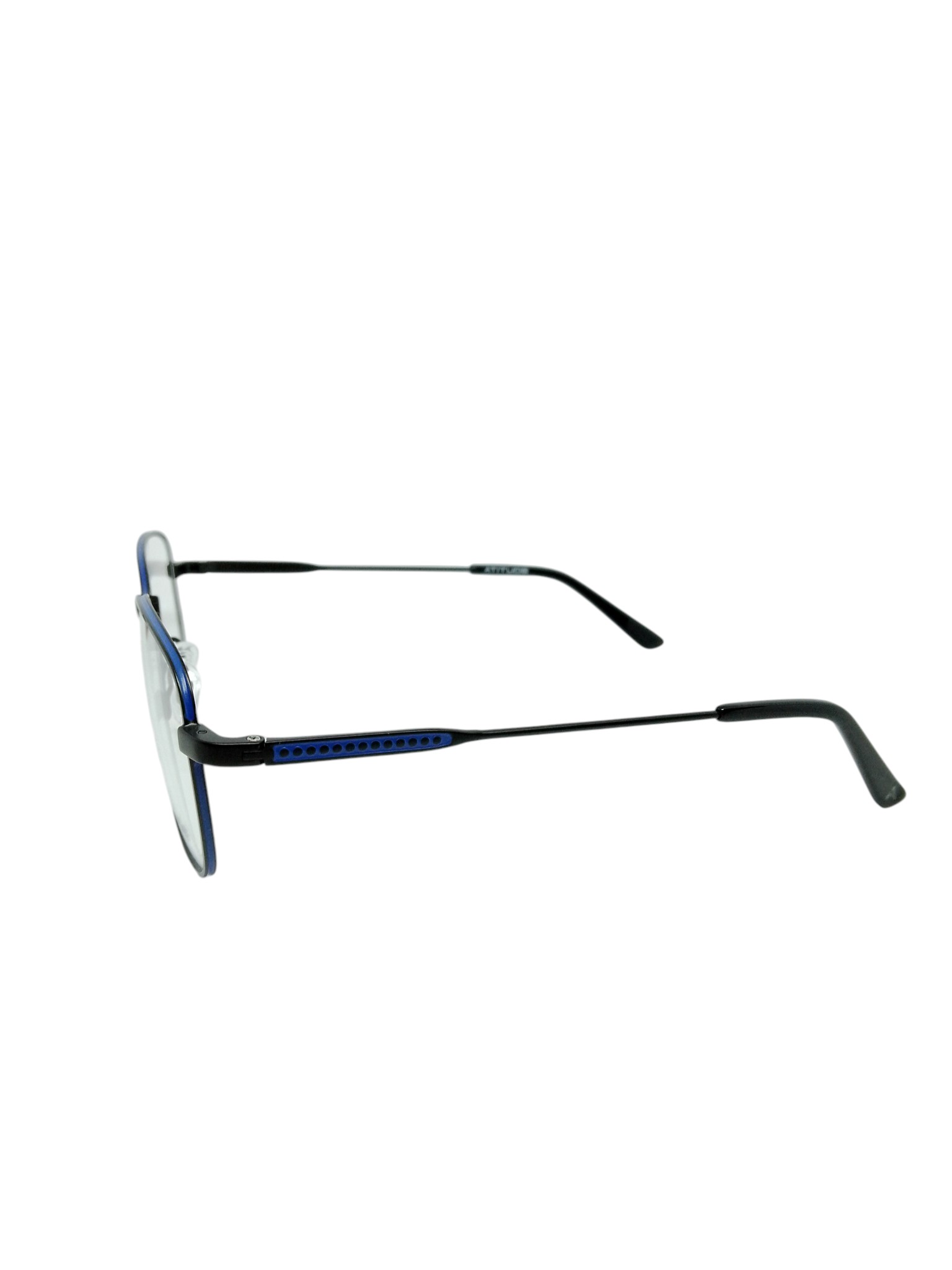 Óculos de grau em aço inox preto com detalhes em azul, design retangular moderno e leve, ideal para quem busca conforto, durabilidade e um visual contemporâneo no dia a dia.