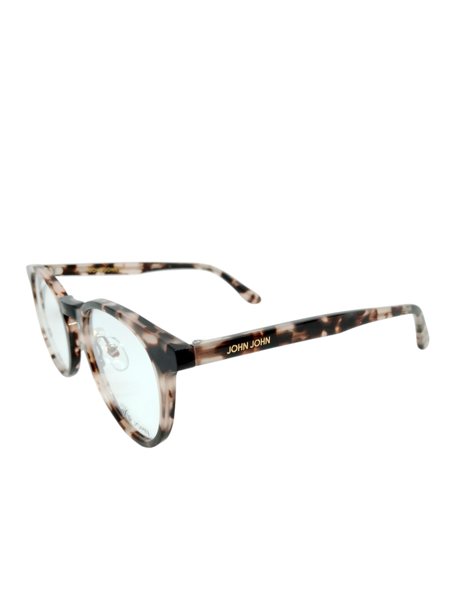 O John John JN0027 C2 é um modelo unissex que mistura design retrô e estilo moderno. A armação é confeccionada em acetato premium com padrão havana claro, apresentando tons mesclados de bege, marrom e âmbar. O formato redondo com aro fechado remete ao estilo vintage, enquanto as hastes finas com o logotipo John John em dourado trazem o toque contemporâneo característico da marca. As plaquetas ajustáveis garantem conforto e excelente adaptação ao rosto.