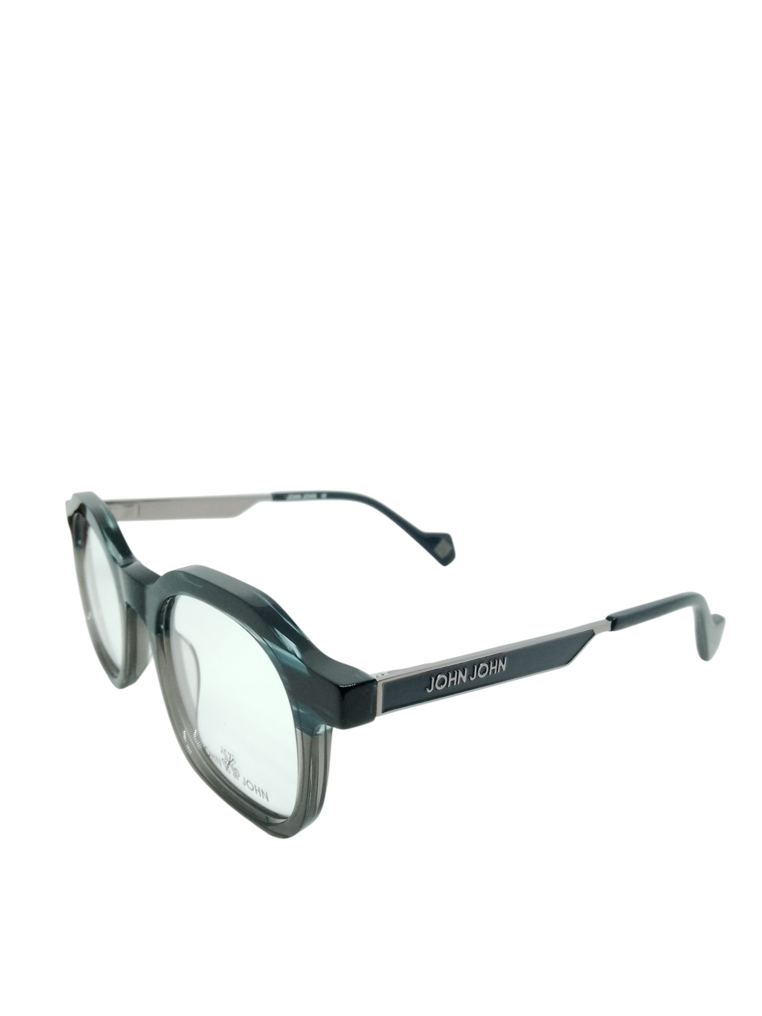 O modelo John John JN0056 C2 apresenta uma estética contemporânea com personalidade marcante. Sua estrutura é confeccionada em acetato translúcido cinza, com a parte frontal em tom azul petróleo, criando um visual moderno e equilibrado.