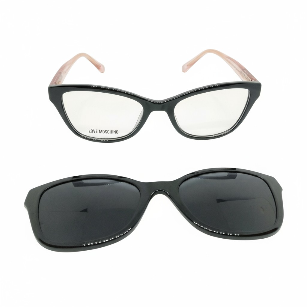 Um conjunto prático e estiloso para quem precisa de óculos no cotidiano e quer a conveniência do clip-on solar, com o toque fashion da Love Moschino.