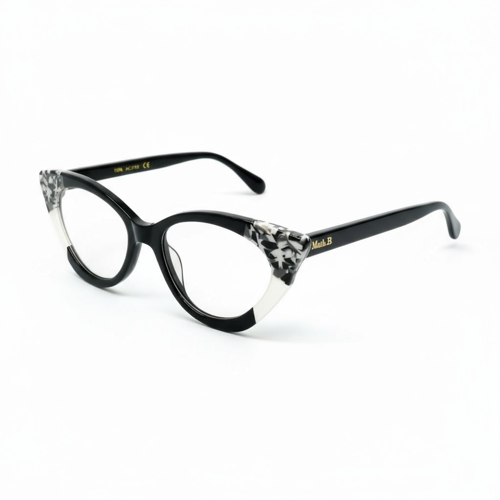 O modelo Math.B DLYY 7038 C1 é puro charme e ousadia em formato gatinho retrô. Produzido em acetato preto com laterais em tom marmorizado branco e preto, esse design mistura sofisticação e estilo artístico em uma peça única.