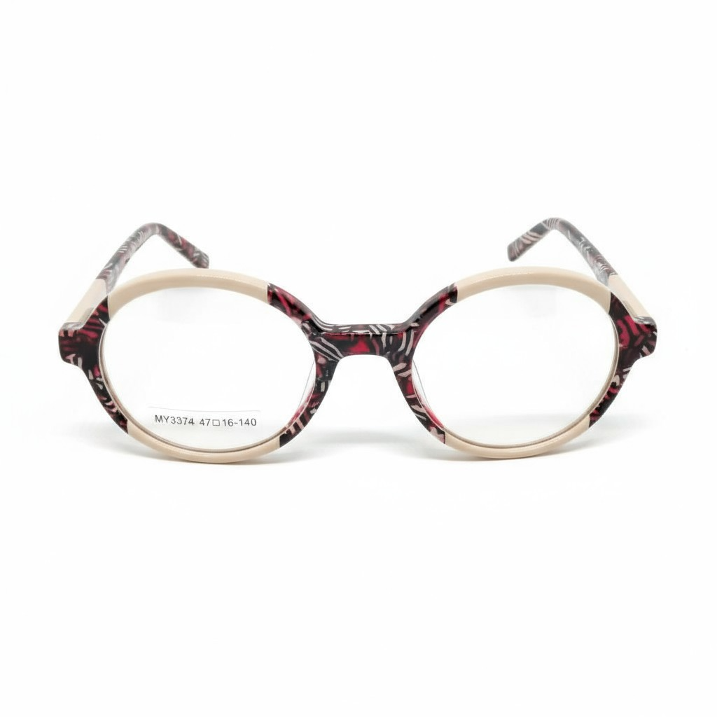 O modelo Math.B MY3374 C4 traz uma combinação ousada e moderna com toque artístico. Sua armação redonda em acetato com estampa abstrata vermelha e preta, complementada pela parte superior em bege claro, cria um contraste elegante e criativo.