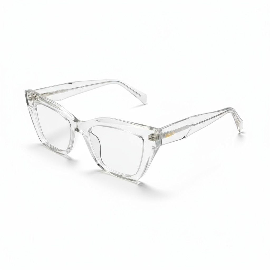 As hastes em acetato cristal seguem o mesmo acabamento translúcido, garantindo unidade estética, conforto e leveza durante o uso diário.