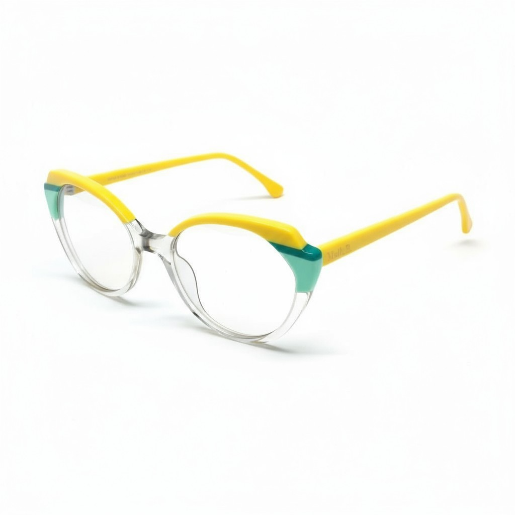 A parte superior amarela destaca o olhar com energia e estilo, enquanto os detalhes em verde nas extremidades criam um contraste ousado e super atual.