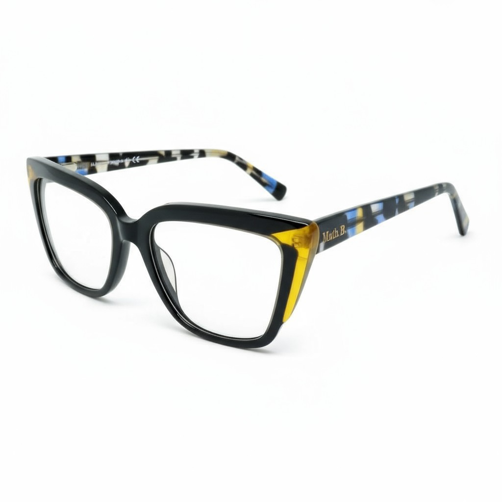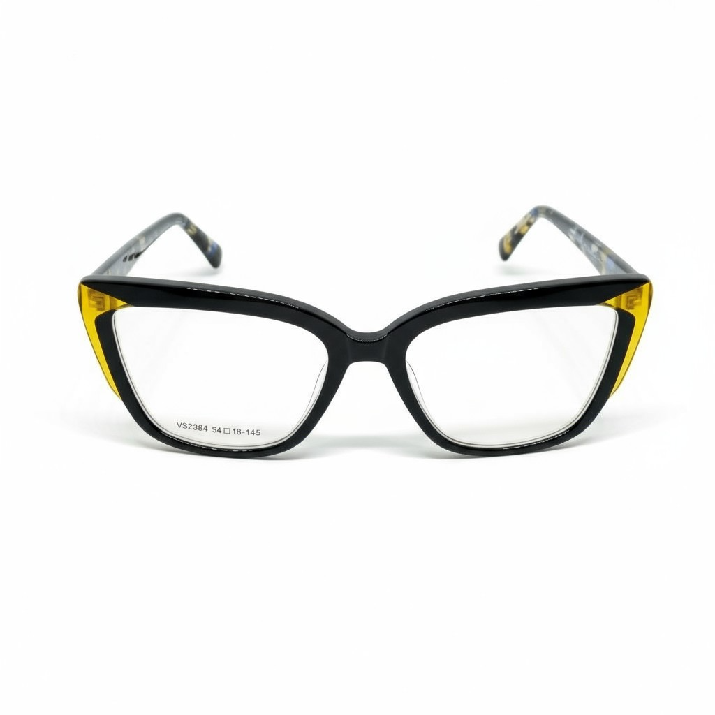 O modelo Math.B VS2384 C1 é uma peça cheia de estilo, combinando modernidade, elegância e um toque ousado nas cores. Sua frente em acetato preto recebe detalhes laterais em amarelo translúcido, criando um efeito visual sofisticado e muito marcante — ideal para quem ama armações com personalidade.