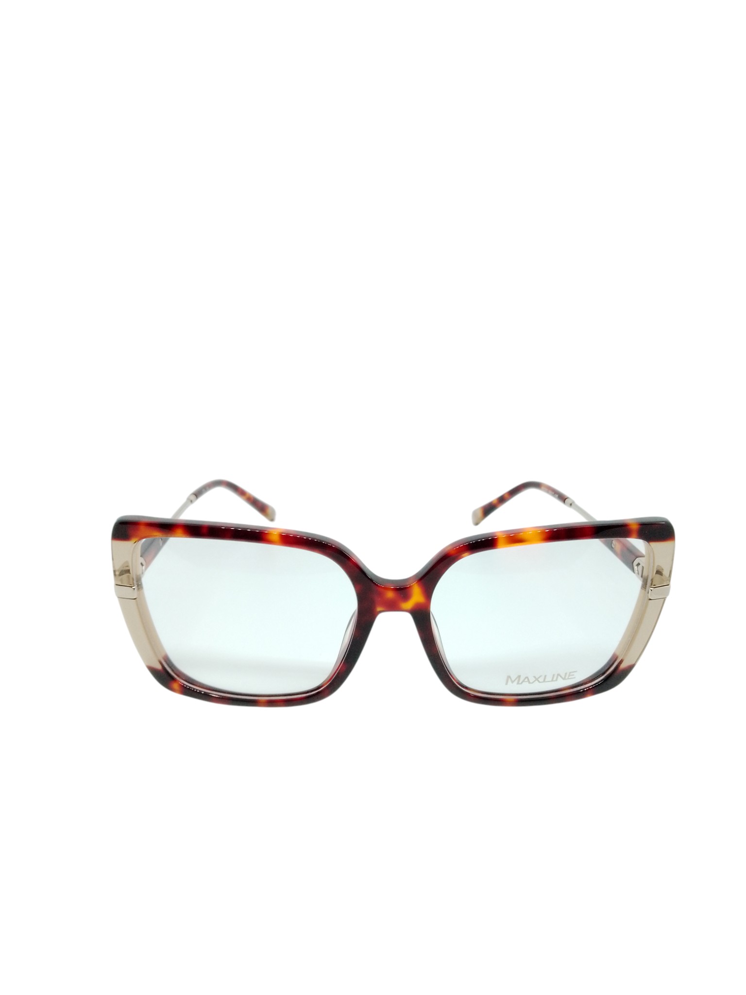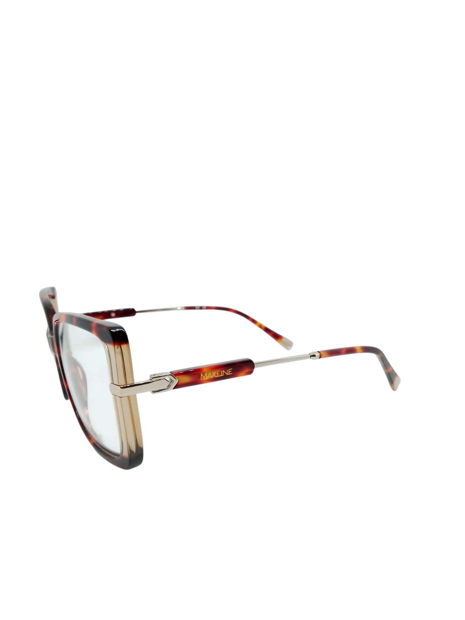 As laterais possuem detalhes metálicos dourados que se estendem às hastes, criando uma transição sofisticada entre o acetato e o metal. As hastes, finas e leves, seguem o mesmo padrão havana com o logotipo Maxline em dourado, garantindo um toque de requinte.