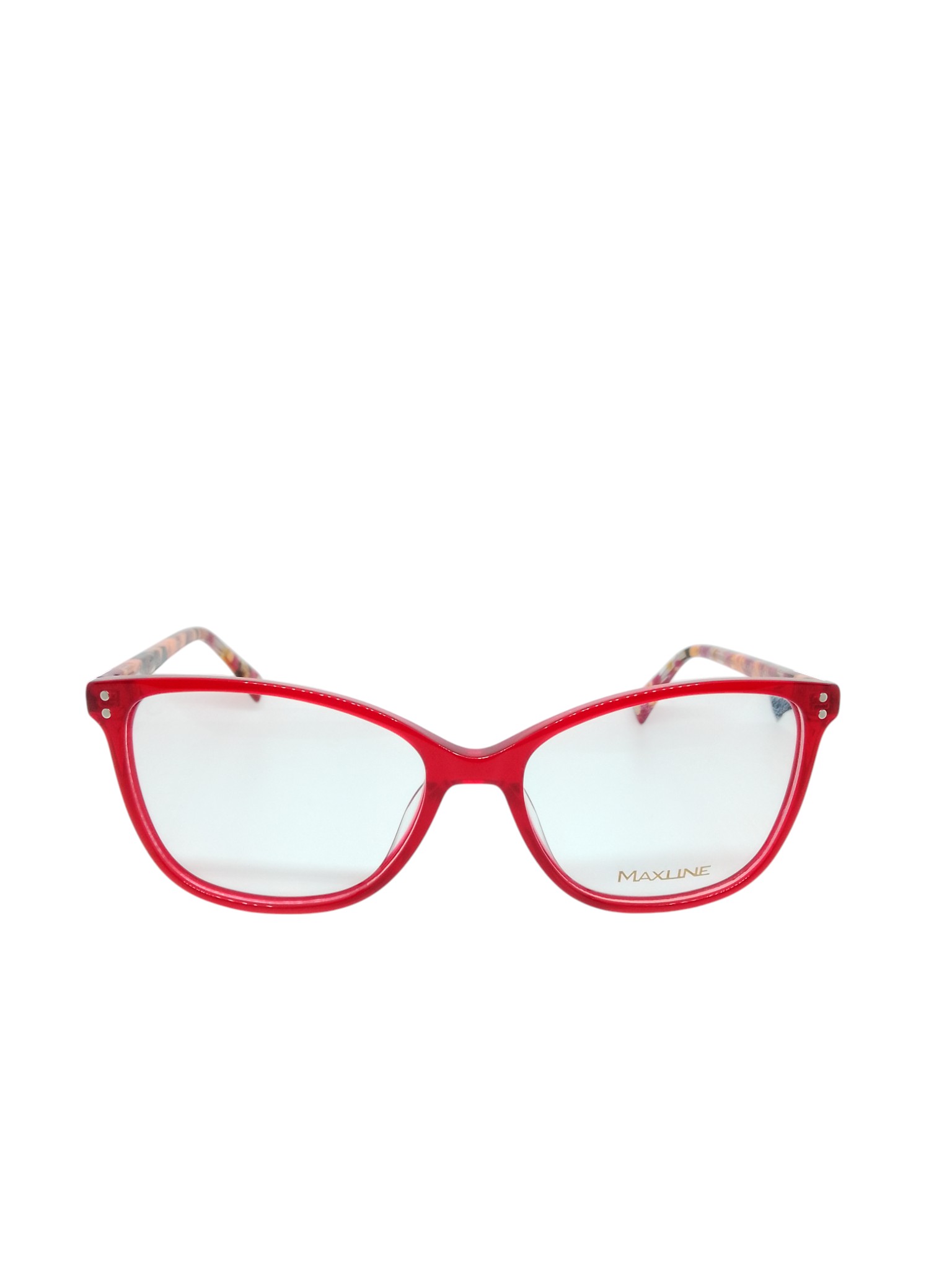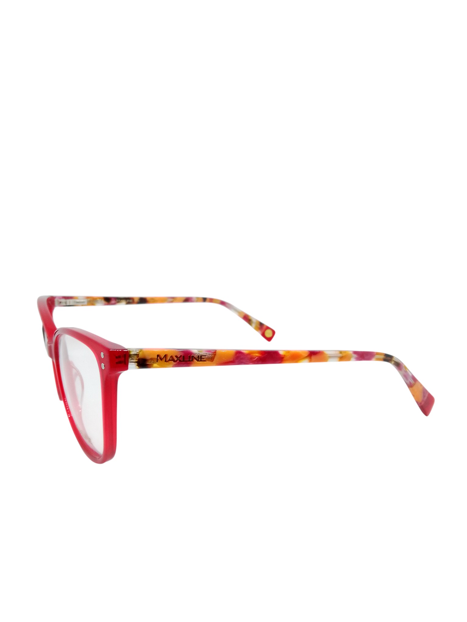 As hastes são o destaque do modelo — com padrão multicolorido em tons de vermelho, rosa, laranja e amarelo, elas trazem um toque artístico e moderno. O logotipo Maxline aparece discretamente em dourado nas laterais, reforçando a sofisticação da marca.