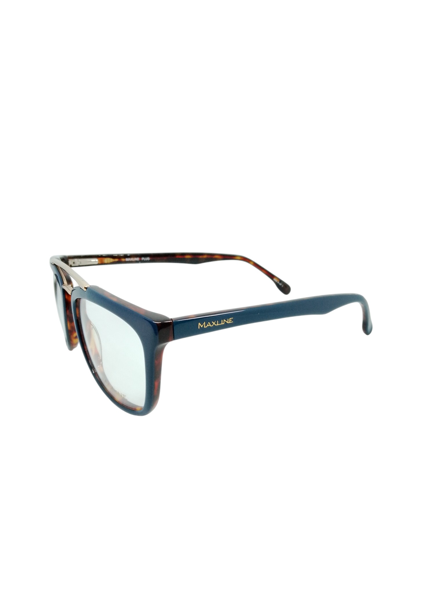 O destaque fica por conta da ponte metálica dourada, que cria um visual refinado e moderno, trazendo personalidade ao modelo. As hastes acompanham o mesmo tom azul da frente, com o logotipo Maxline em dourado sutilmente aplicado.
