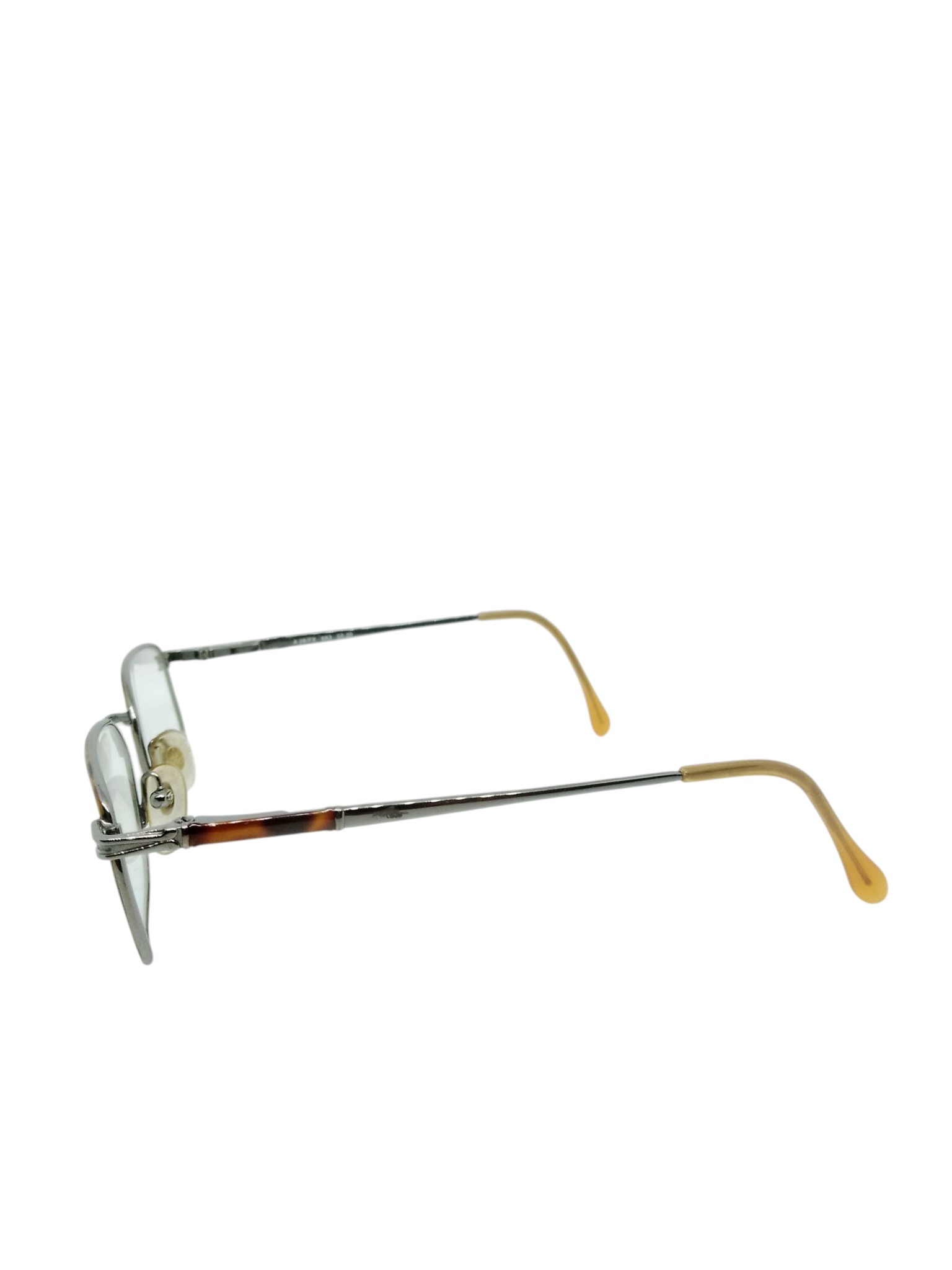 A armação em metal com acabamento prateado ganha destaque com o aro em padrão tartaruga, criando um contraste sofisticado e diferenciado. As hastes finas com ponteiras em tom claro completam o design com leveza e conforto, tornando esse modelo ideal para o uso diário.