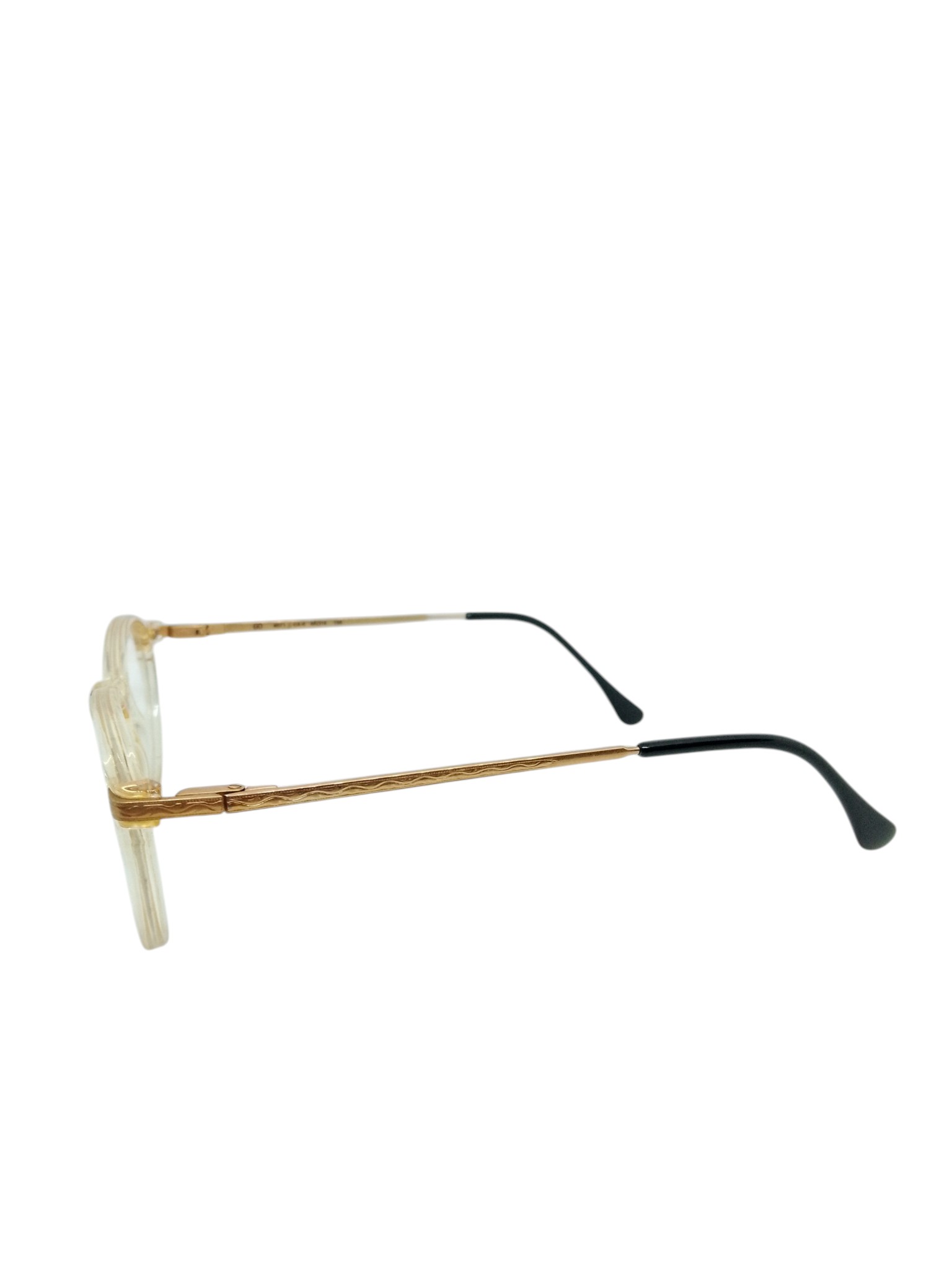 A armação em acetato translúcido em tom champagne traz um acabamento refinado e suave, enquanto o formato arredondado clássico proporciona equilíbrio e harmonia ao rosto. As hastes metálicas com detalhes trabalhados adicionam um toque de sofisticação ao modelo.
