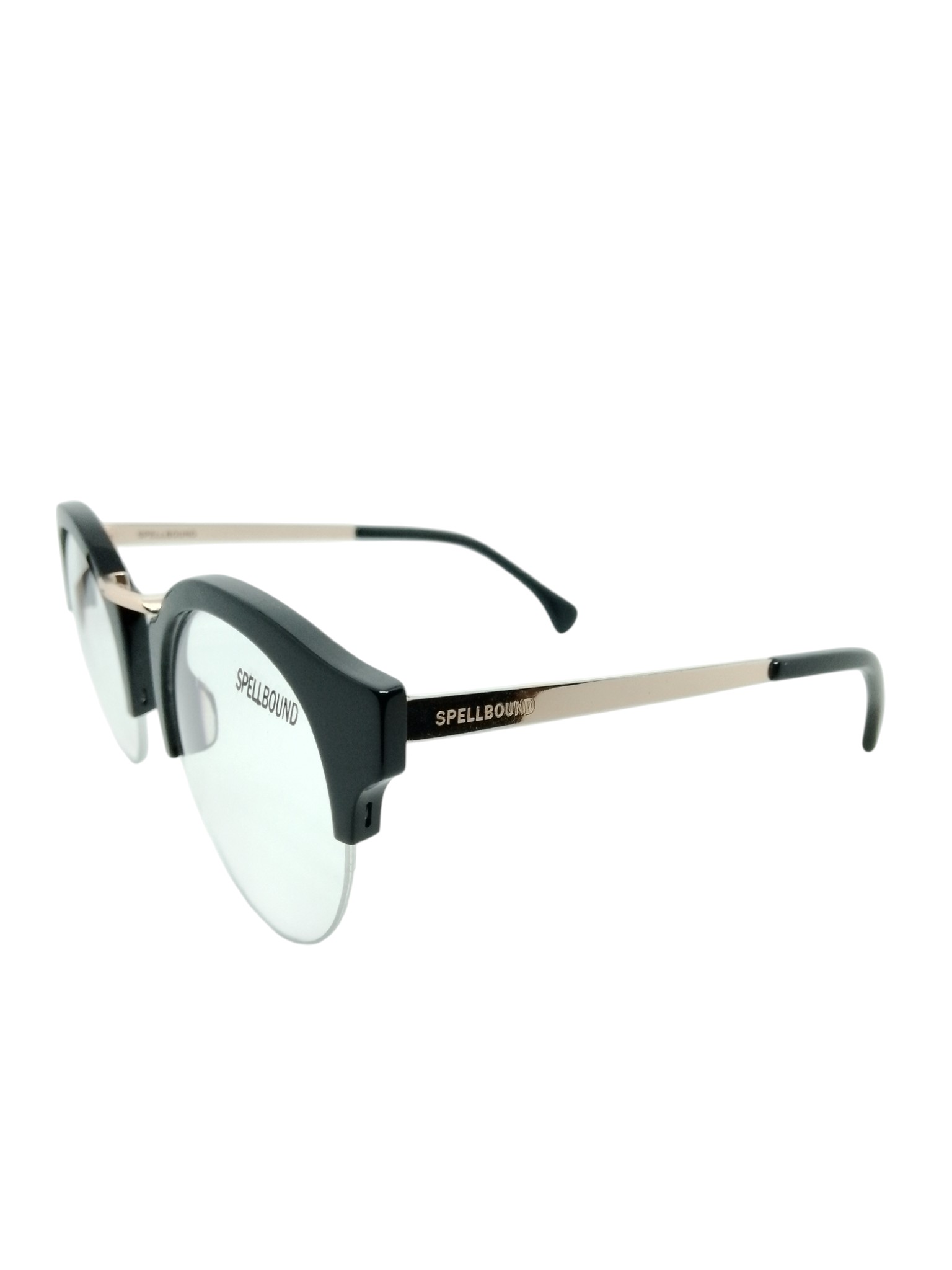O modelo Spellbound SB19997 C1 combina um design retrô e sofisticado em uma releitura moderna. Sua frente em acetato preto de alto brilho com estrutura meio aro traz leveza visual e elegância. A ponte metálica dourada adiciona um toque de luxo e refinamento, equilibrando o estilo clássico e contemporâneo.
