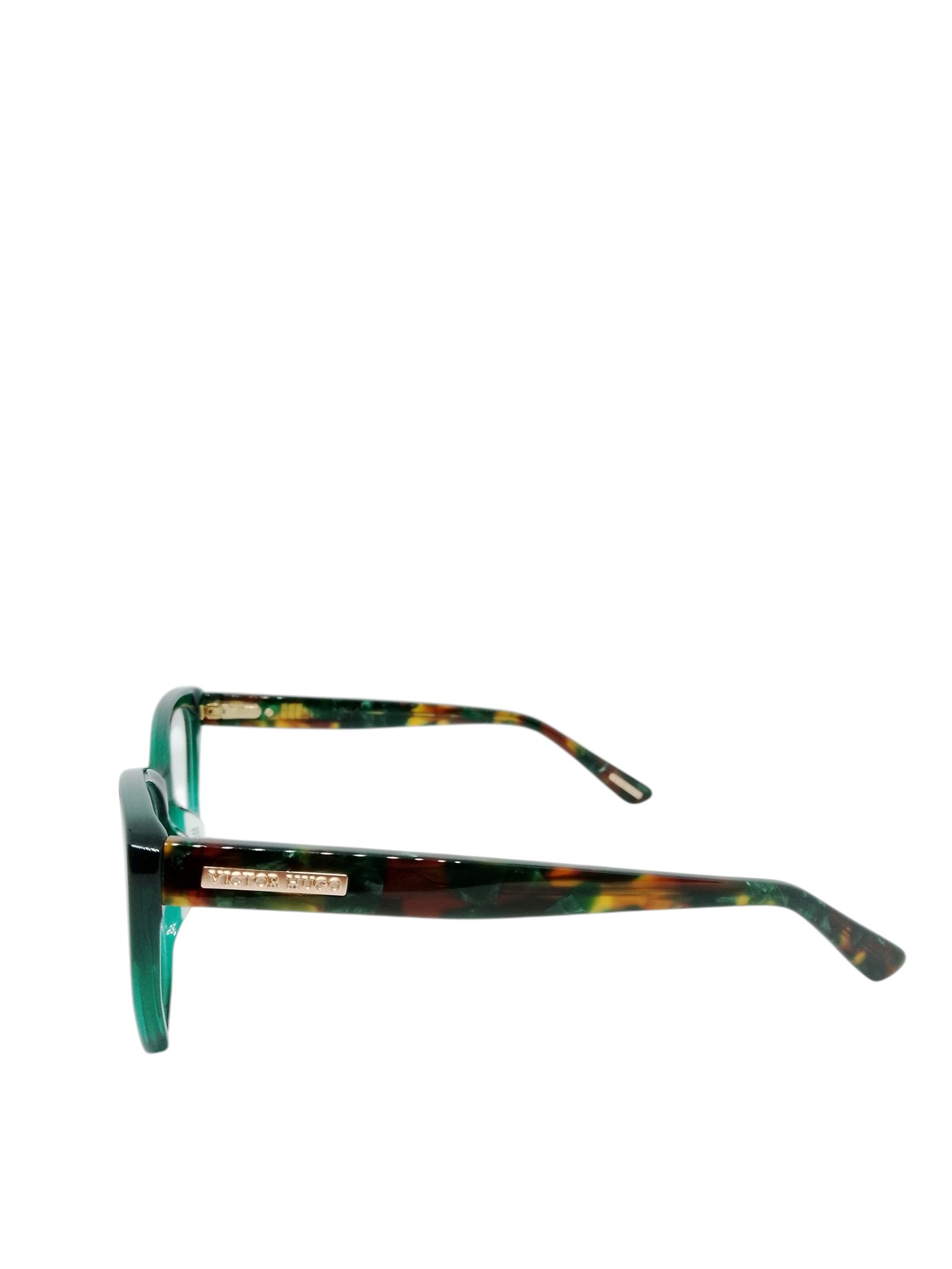 A parte frontal em acetato verde translúcido traz leveza e modernidade, enquanto as hastes com padrão mesclado adicionam um toque de exclusividade e charme à peça. O formato com leve elevação valoriza o olhar e proporciona um encaixe harmonioso no rosto.