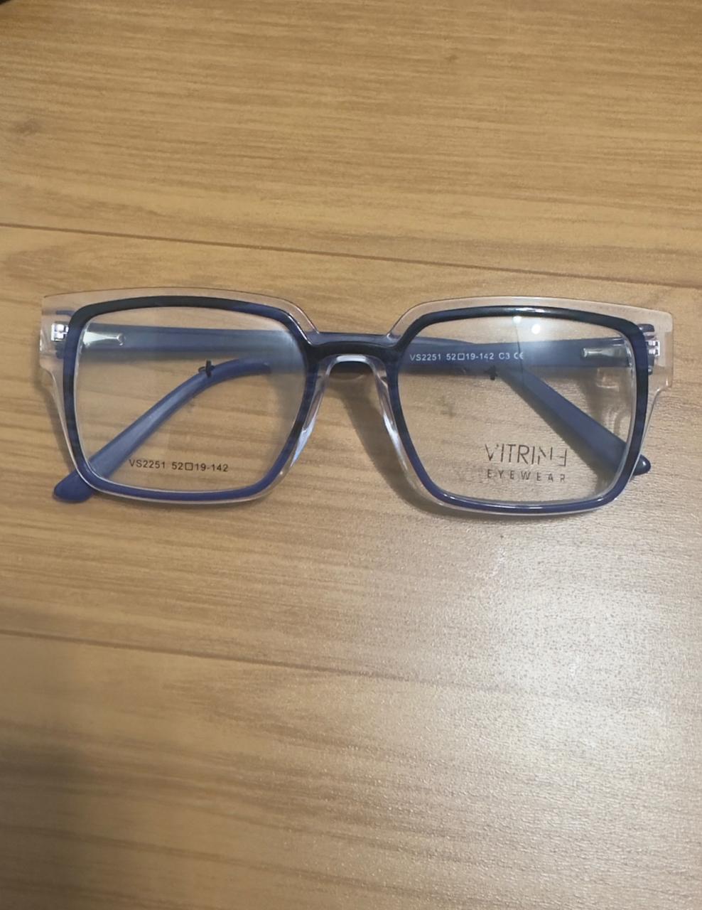 A armação Vitrine Eyewear VS2251 C3 apresenta um design moderno e elegante, combinando transparência com detalhes em azul profundo que trazem sofisticação e leveza ao visual. Seu formato retangular levemente ampliado proporciona excelente campo de visão e harmoniza muito bem com diferentes formatos de rosto.
