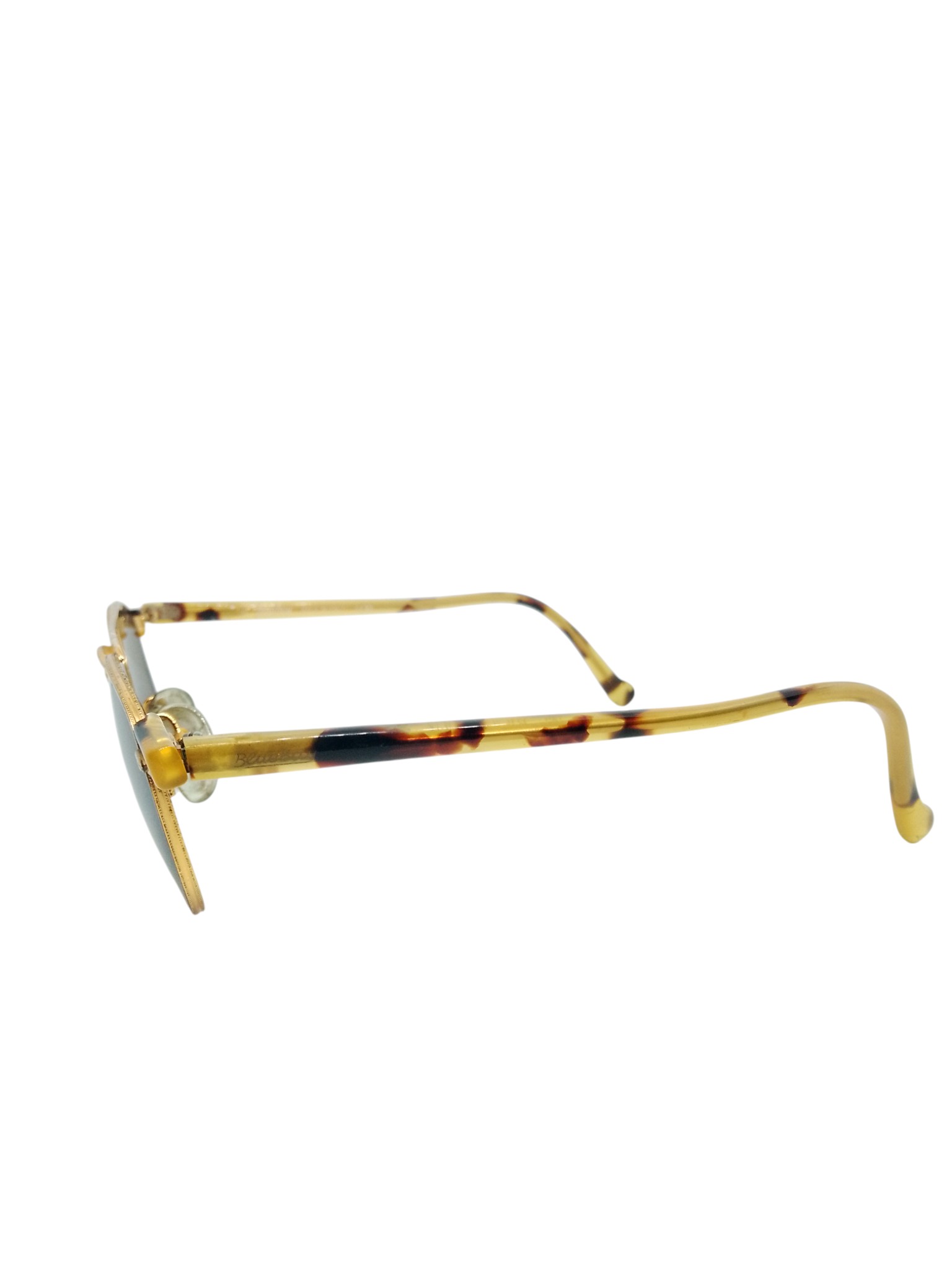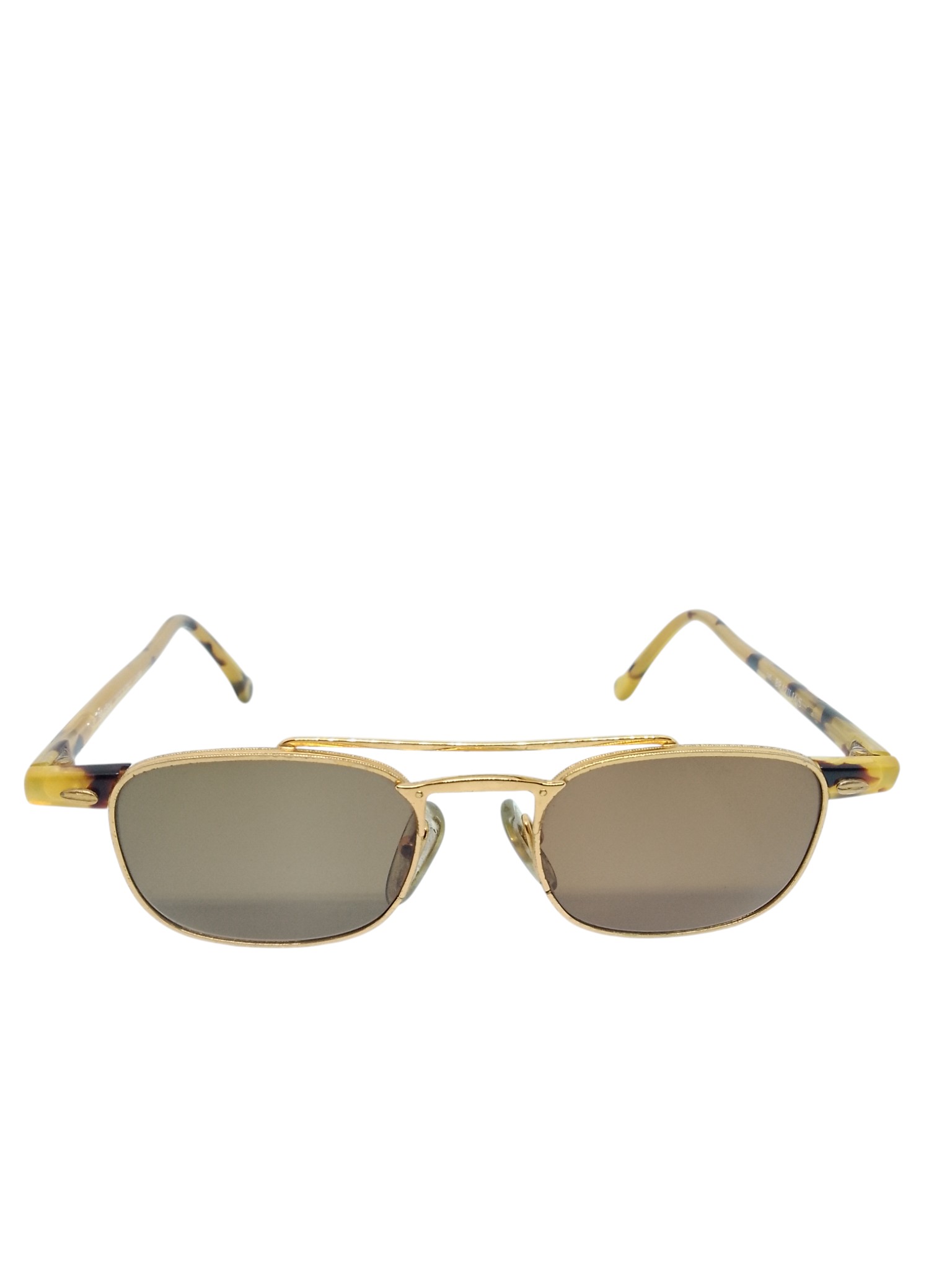 A armação combina estrutura metálica dourada com hastes em acetato tartaruga translúcido, criando um contraste refinado entre o brilho do metal e o efeito marmorizado do material. O design é leve, equilibrado e extremamente confortável, perfeito para uso prolongado no dia a dia ou em produções mais elaboradas.