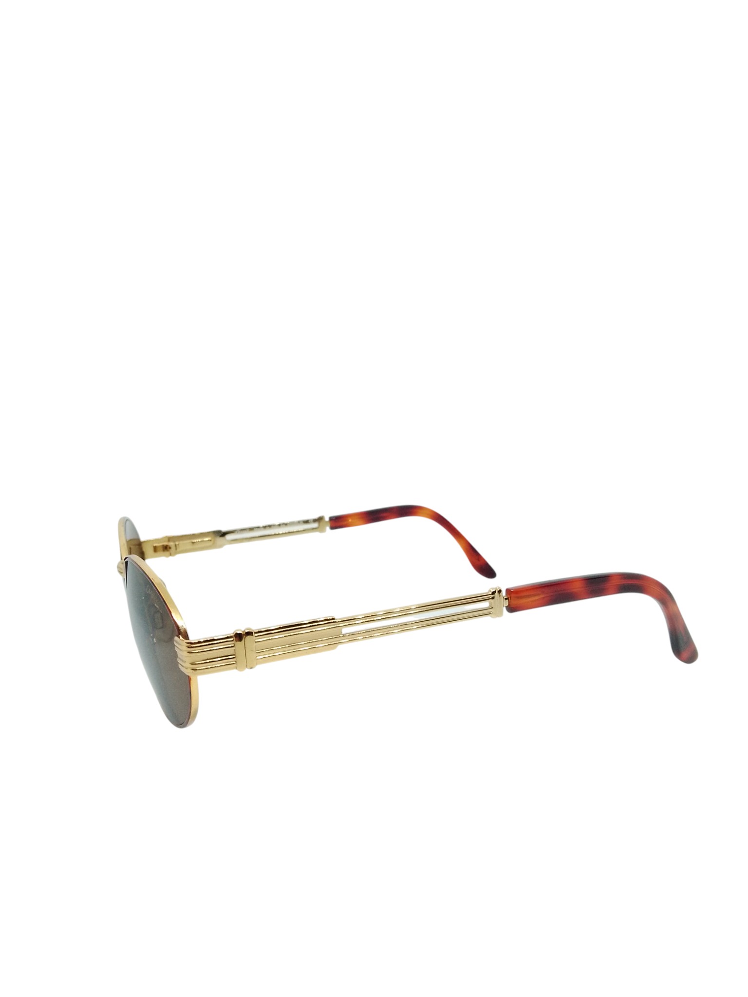 O grande destaque está nas hastes estruturadas com múltiplas camadas metálicas paralelas, criando um efeito arquitetônico e refinado. As extremidades em acetato tartaruga acrescentam conforto térmico e um contraste estético nobre. A ponte dupla metálica reforça o caráter premium do modelo, garantindo estabilidade e um encaixe seguro no rosto. Ideal para quem busca um óculos com identidade forte, estética retrô de luxo e acabamento impecável.