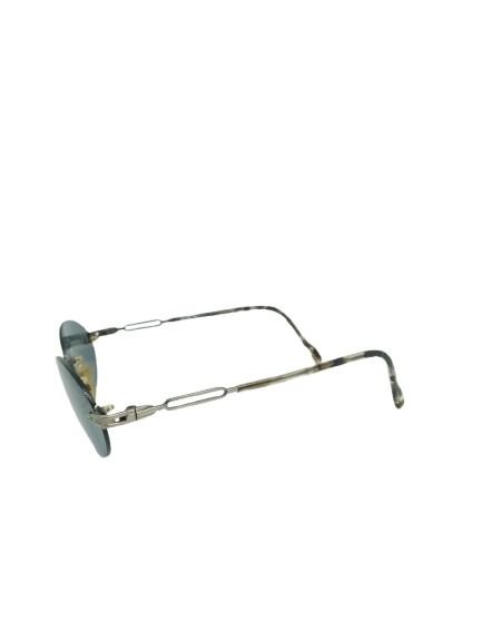 A estrutura metálica fina proporciona leveza e conforto, enquanto as lentes em tom azul acinzentado oferecem proteção solar com uma visão suave e natural. As hastes delicadas reforçam o estilo minimalista, garantindo um encaixe confortável para uso prolongado.
