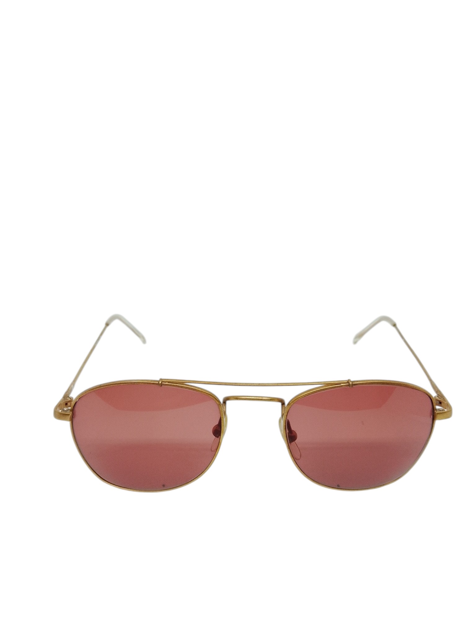 Sua estrutura metálica dourada proporciona leveza e sofisticação, enquanto a ponte dupla superior reforça o estilo vintage característico desse modelo. As hastes finas com ponteiras claras garantem conforto e um encaixe agradável durante o uso. As lentes ajudam a reduzir a intensidade da luz, proporcionando conforto visual em ambientes externos.