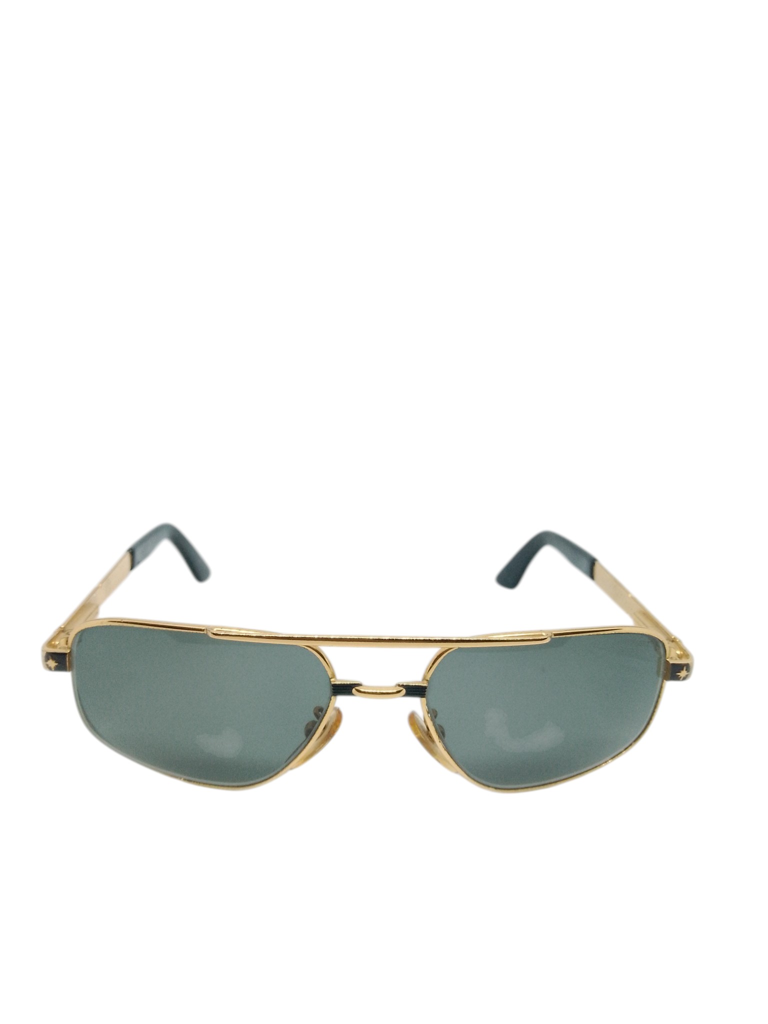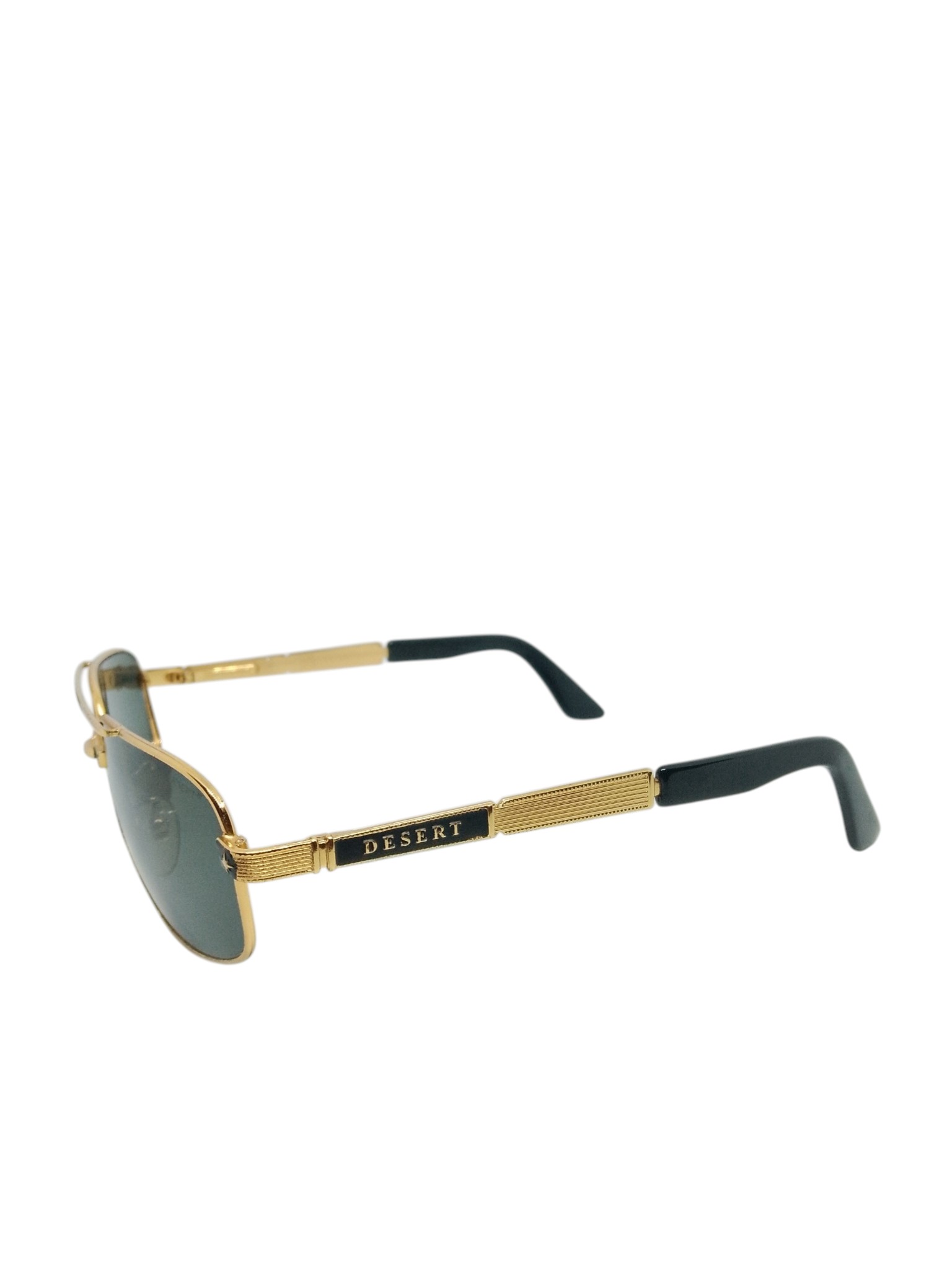 Sua estrutura metálica dourada reforça o estilo clássico e sofisticado do modelo, enquanto a ponte dupla superior acrescenta personalidade e um toque vintage ao design. As hastes metálicas contam com detalhe da marca DESERT, trazendo identidade e exclusividade ao óculos. As ponteiras em tom escuro garantem conforto e melhor encaixe durante o uso.