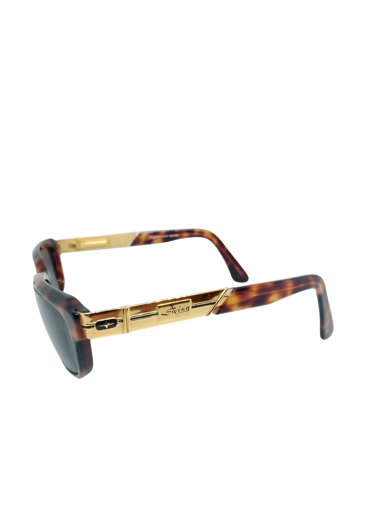 O grande destaque fica por conta das hastes com estrutura metálica dourada aparente, com assinatura “Swing” gravada, remetendo a modelos de alto padrão dos anos 70 e 80. Essa combinação de metal polido com acetato confere um aspecto premium, ao mesmo tempo em que garante resistência estrutural e excelente durabilidade. As lentes em tom cinza sólido proporcionam conforto visual e proteção solar eficiente.