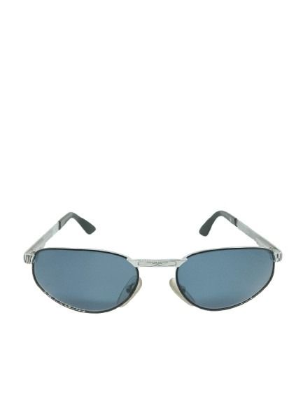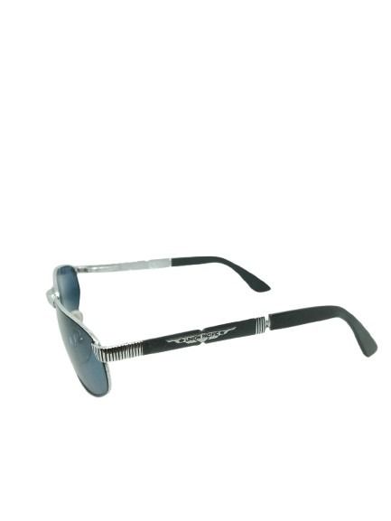 A armação metálica prateada oferece leveza e durabilidade, enquanto as lentes azuladas garantem conforto visual e proteção solar, reduzindo o brilho e proporcionando uma visão mais suave. As hastes com detalhes texturizados reforçam o acabamento premium e agregam personalidade ao modelo.