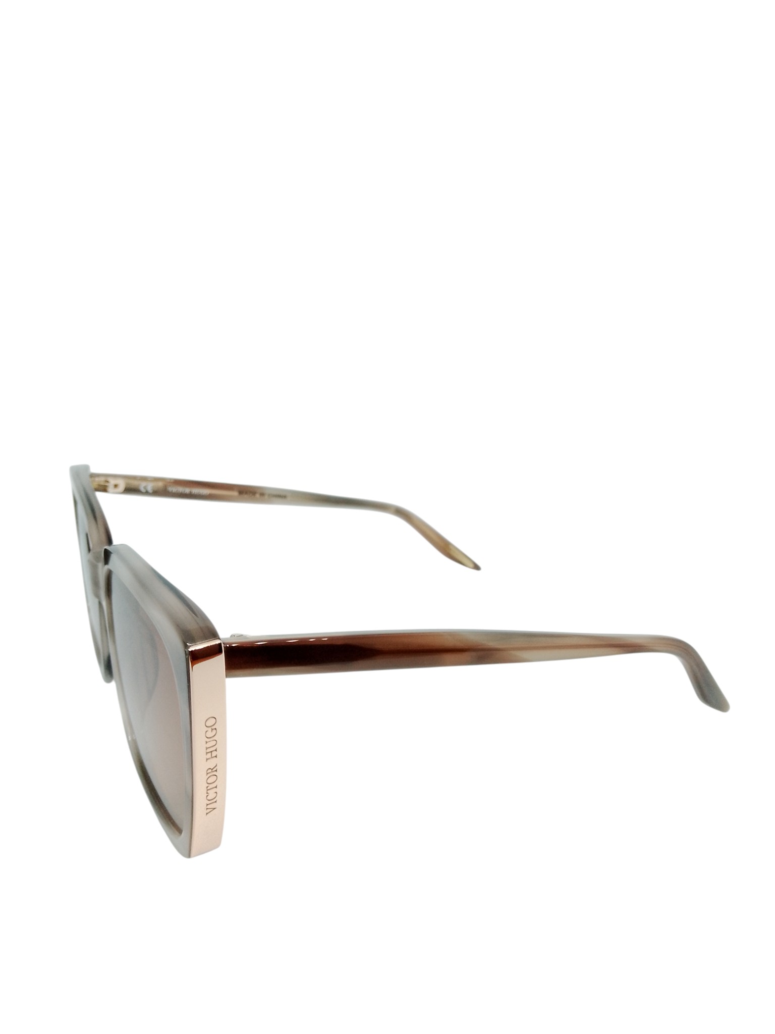 O Victor Hugo SH1899 COL.0AHD combina sofisticação e modernidade em um design marcante no formato gatinho quadrado. Sua frente em acetato premium apresenta um belíssimo efeito marmorizado em tons de marrom e cinza, criando profundidade e elegância.