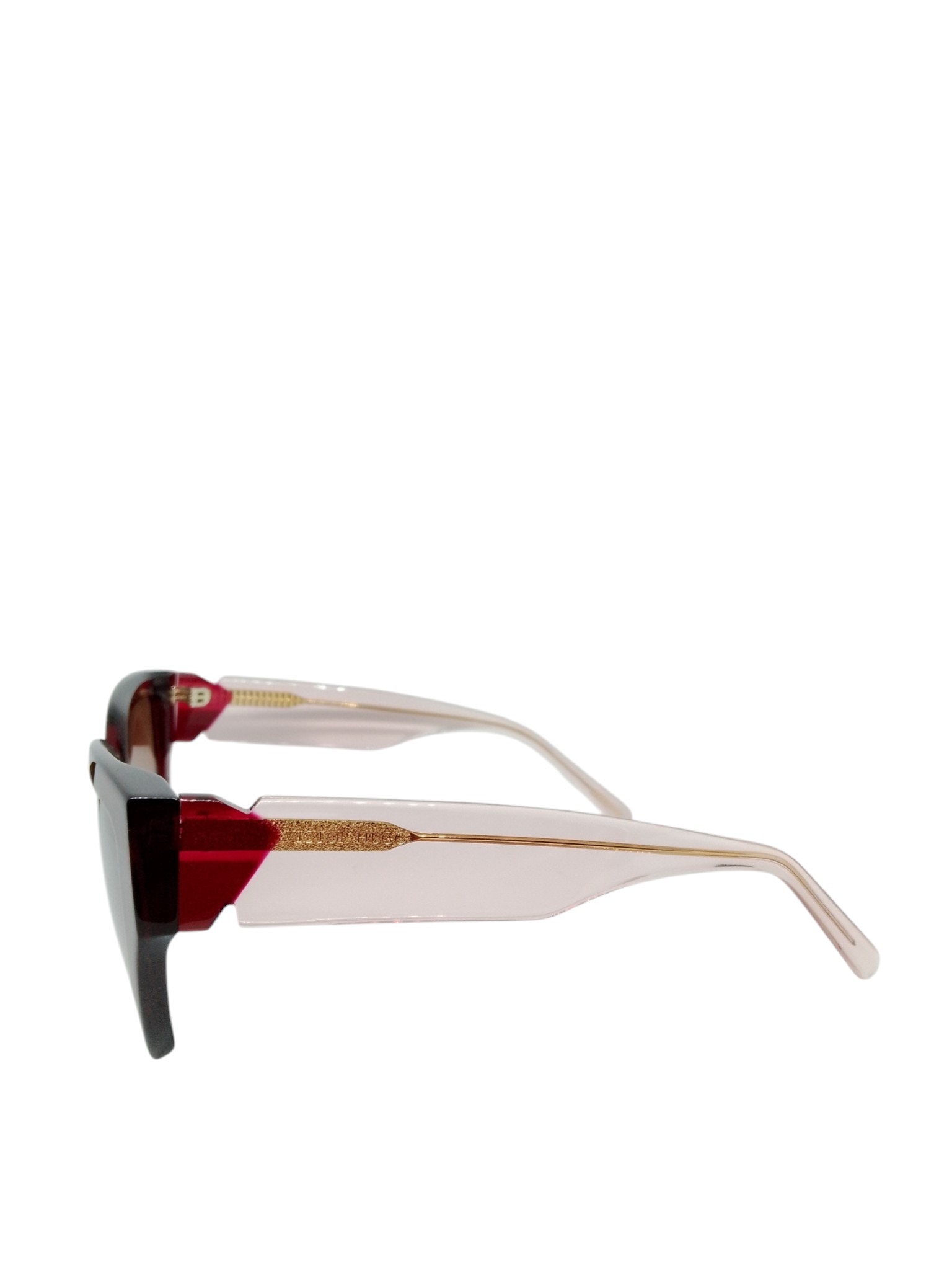 A armação em acetato com acabamento em vermelho e preto traz um contraste refinado, enquanto as hastes translúcidas com detalhe dourado adicionam um toque de exclusividade e requinte. As lentes em tom degradê garantem conforto visual e um visual ainda mais elegante.