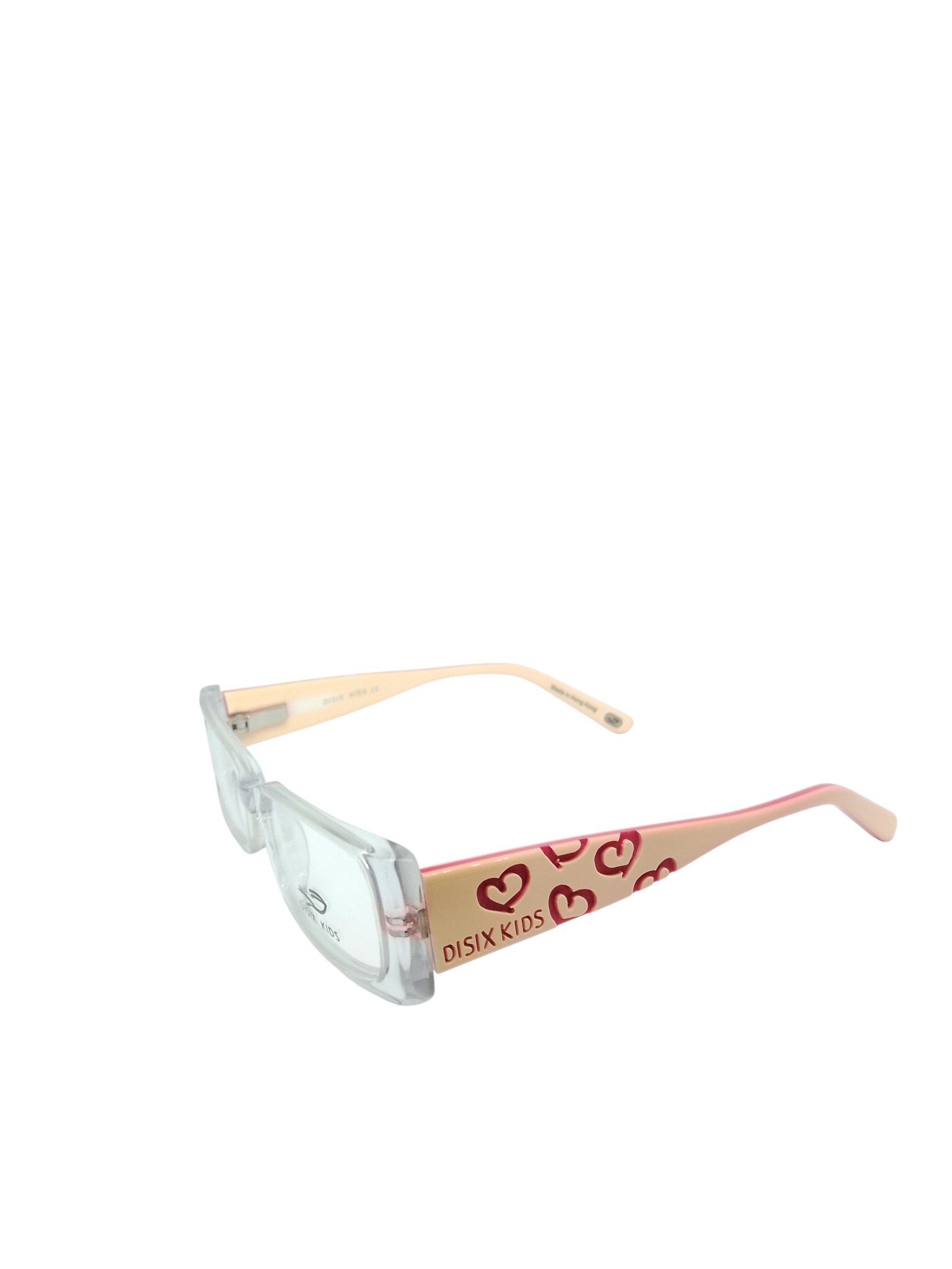 O modelo Disix Kids 1005 C2 é perfeito para crianças que gostam de óculos divertidos, modernos e confortáveis. A frente em acetato cristal traz leveza e suavidade ao visual, enquanto as hastes em tom pêssego/rosa com estampas de corações vermelhos deixam o modelo ainda mais encantador e cheio de personalidade.